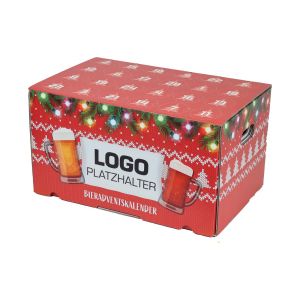24 Türchen – 24 Biere! Versüßen Sie Ihren Kunden die Weihnachtszeit mit unserem individuell bedruckbaren und befüllbaren Bier-Adventskalender! Gestalten Sie Ihren ganz persönlichen Bier-Adventskalender ab einer Mindestbestellmenge von 50 Stück, perfekt abgestimmt auf Ihre Marke. Befüllen Sie ihn flexibel mit Ihren eigenen Produkten und schaffen Sie ein besonderes Highlight zur Adventszeit.